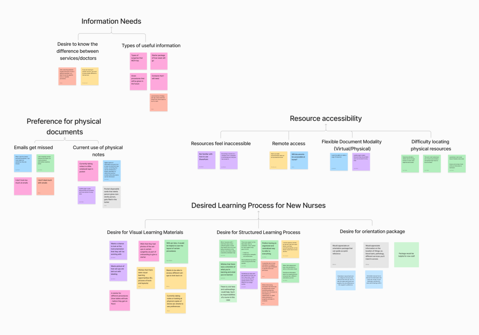 After being assigned to our clients at Women's College Hospital, my team of UX Designers learned about their desires to create a comprehensive platform to assist in the information retrieval needs of onboarding nurses at the hospital. In order to facilitate this, my team conducted user research to understand the needs of new nurses and mental models for information organization.
