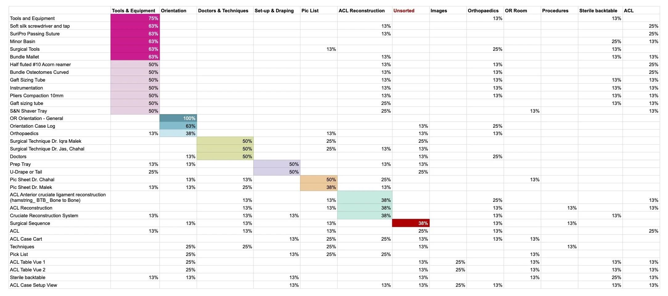 As the first step in our user study, we conducted 15 minute card sorting sessions with 8 nurses at the hospital, recruited by our clients, in order to understand mental model of users and expectations of labeling conventions. Each nurse sorted 35 content cards created from existing SharePoint documents and labels. Following the study, I completed a quantitative analysis of the data to allow us to view trends in the study results, as is shown below.